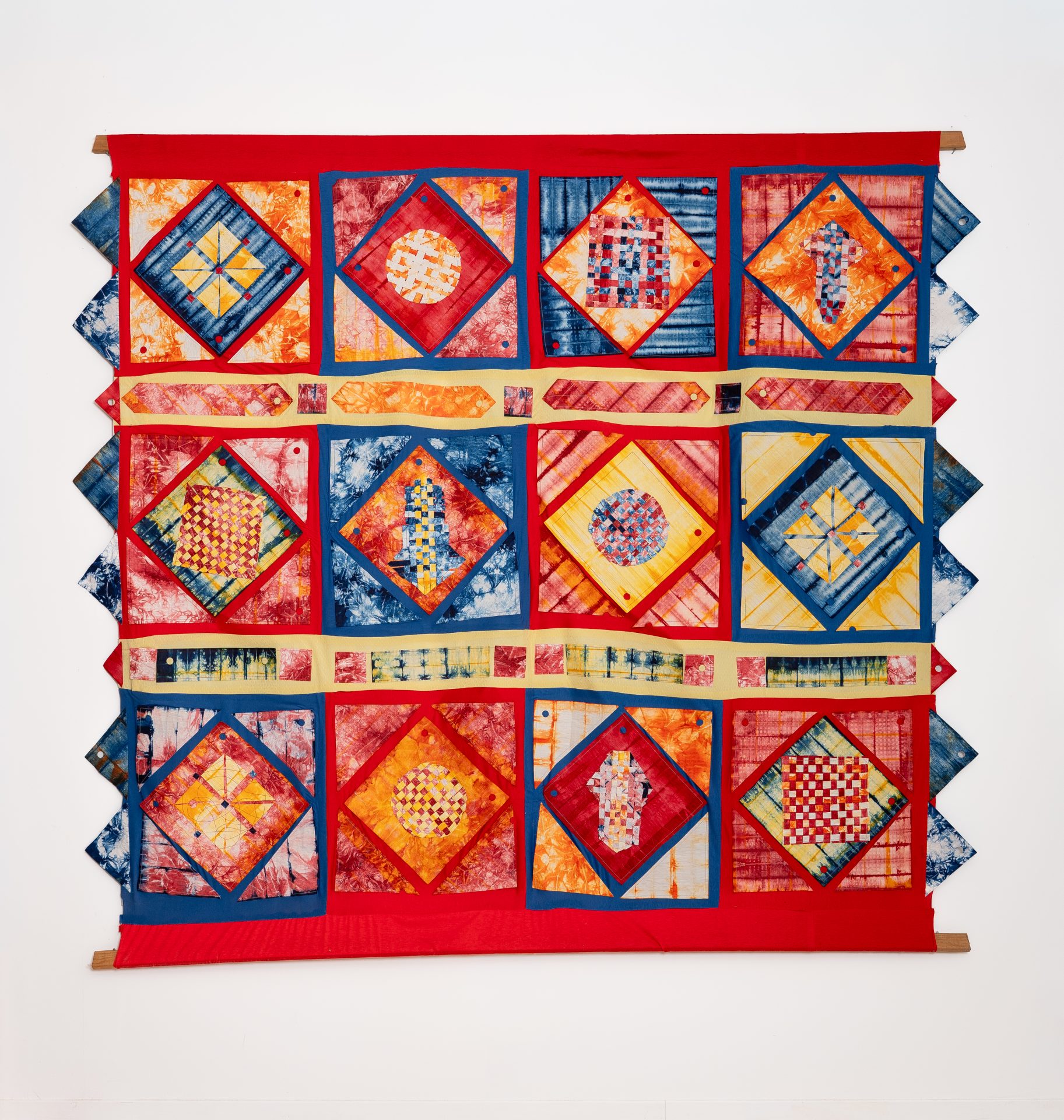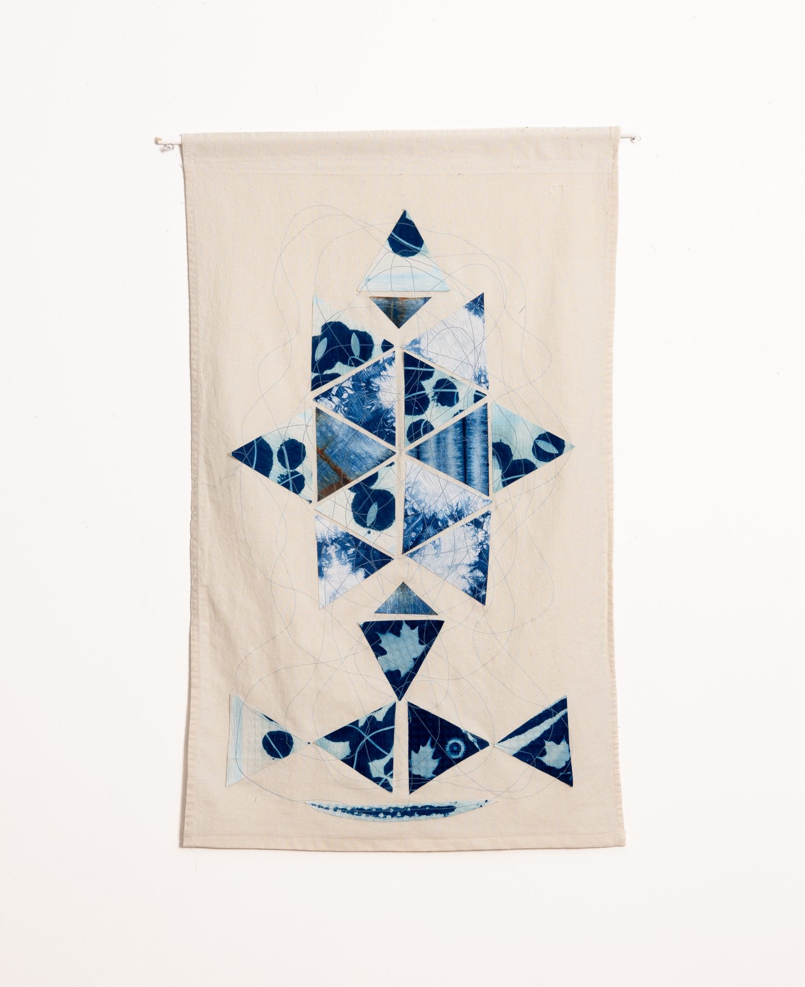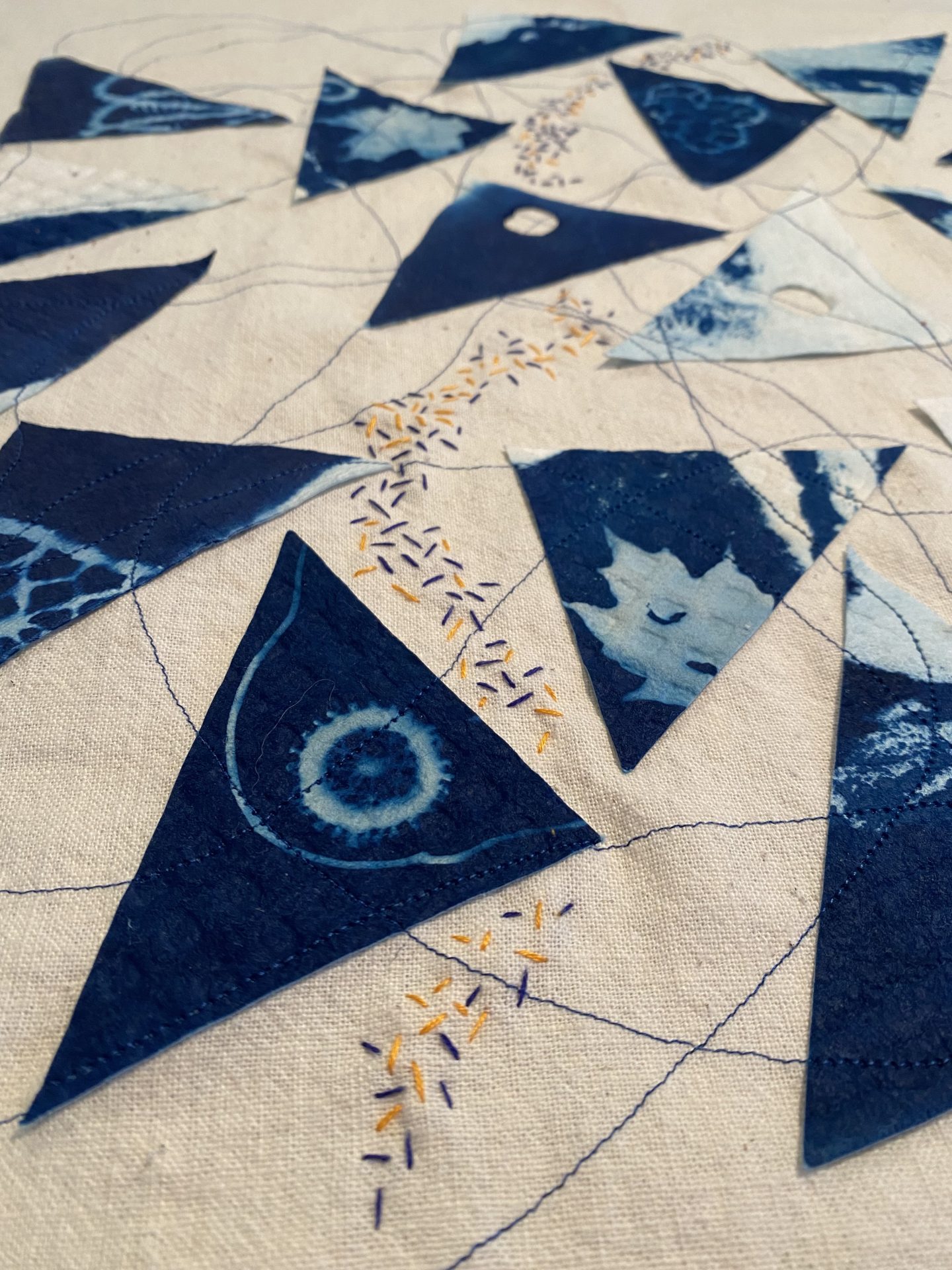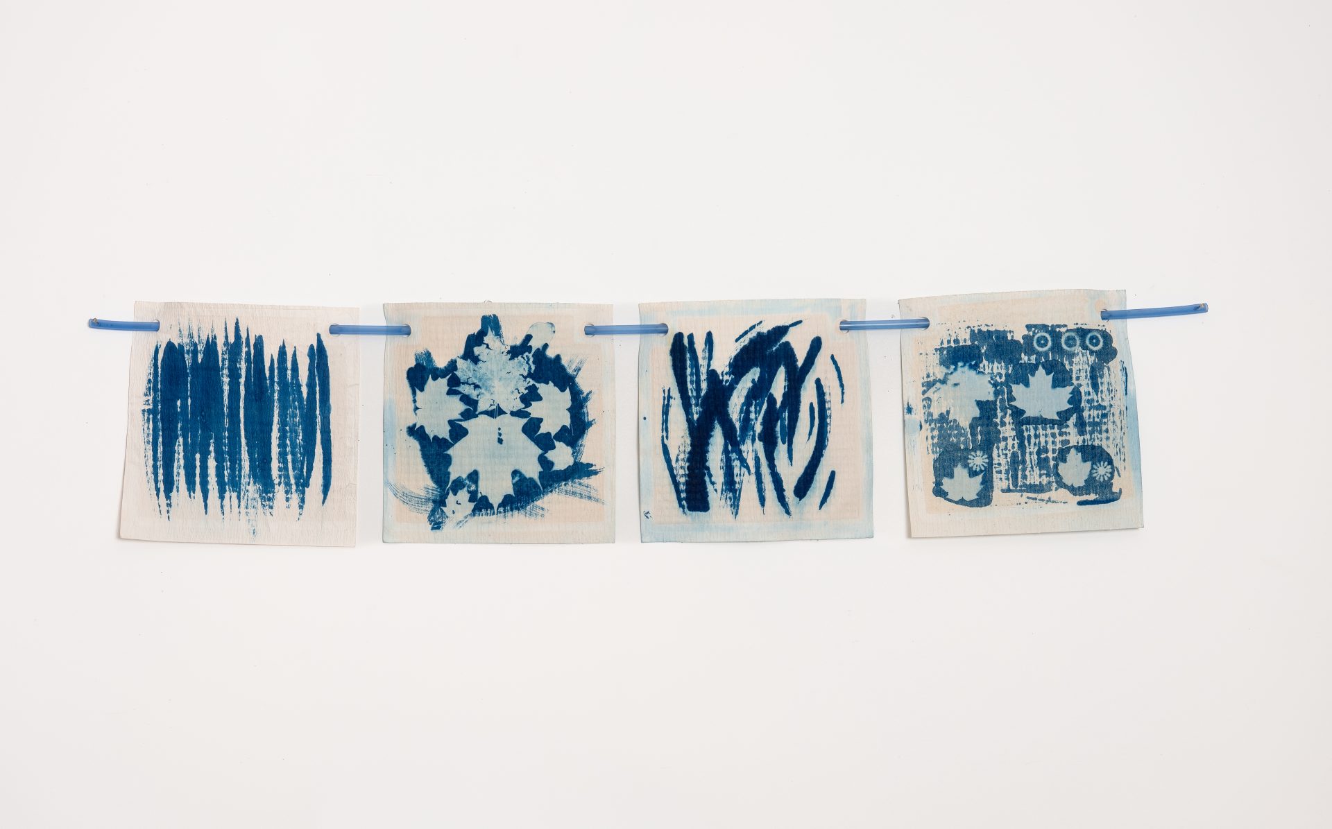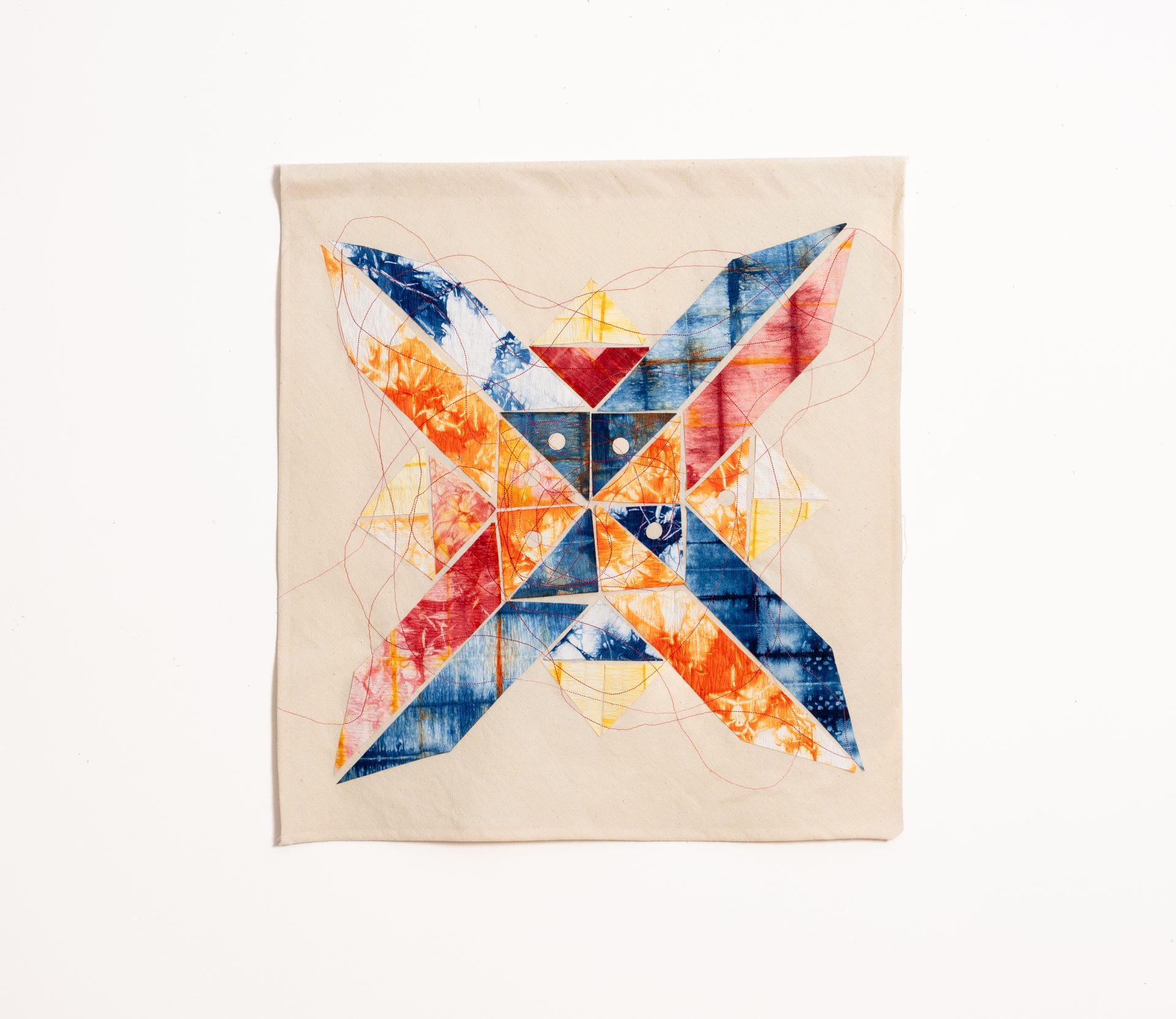 Ce projet, explore les filtres à sirop d’érable — récupérés après usage, nettoyés, puis teints à la manière du shibori ou cyanotype. Marqués par la sève, ces filtres deviennent des surfaces sensibles, porteuses d’empreintes invisibles. Ils sont découpés et réassemblés en blocs colorés aux formes géométriques, ou tissés entre eux dans un esprit inspiré de la courtepointe